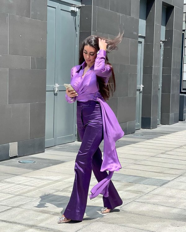 في إطلالة أخرى لياسمين، اختارت النجمة العربية اللون البنفسجي. وقد اعتمدت تدرّجي هذا اللون، الفاتح والغامق. وفي هذا اللوك، رافقت البنطال الساتيني باللون البنفسجي الداكن ببلوزة ساتينية أيضاً باللون البنفسجي الفاتح. وقد لاقت ياسمين الكثير من التعليقات الإيجابية حول هذا اللوك.