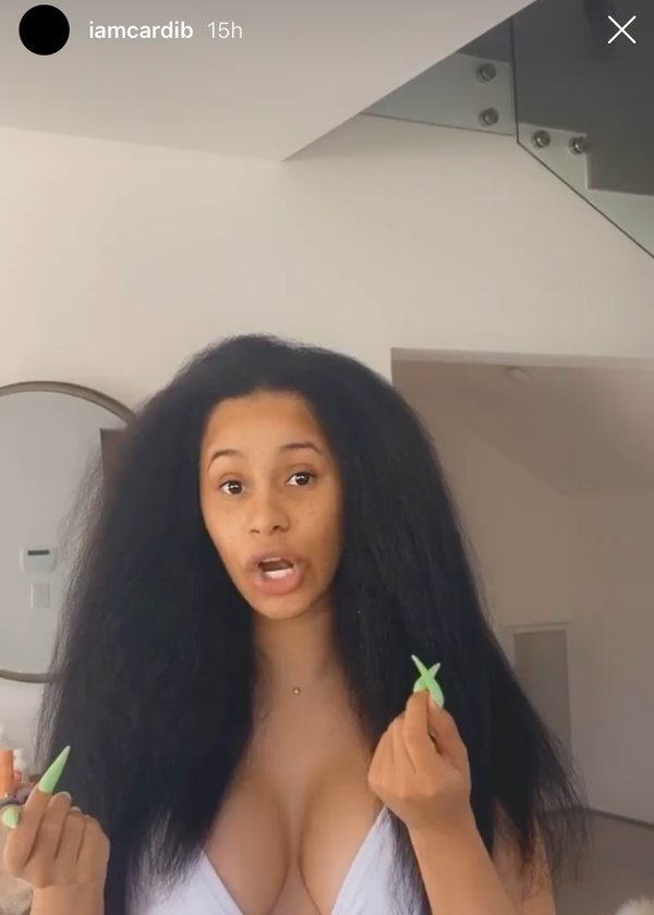 وفي سلسلة الفيديوهات التي نشرتها على الستوري، أوضحت Cardi B أنّ شعرها يصبح مالساً نوعاً ما حين تجفّفه، غير أنّه ينفش بعد يومين من دون أن يتّخذ شكل أيّ تجعّدات. وشعرها في الواقع كثيف للغاية ويحيط برأسها مع حجم كبير. وقد أكّدت بعدها أنّ حل شعرها يكمن في ترطيبها.
