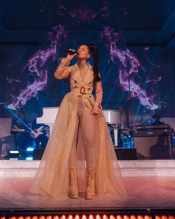 وبالعودة إلى تسريحة كيز، جاءت أولاً كتسريحة ذيل حصان مرتفعة للغاية، مع ضفيرة عريضة للغاية تتداخل إلى جزء منها ضفائر رفيعة تماماً. ويبدو وكأنّ هذه الضفائر الرفيعة أضيفت إلى شعر النجمة الطبيعي، لأنّ لونها يبدو مغايراً بعض الشيء.