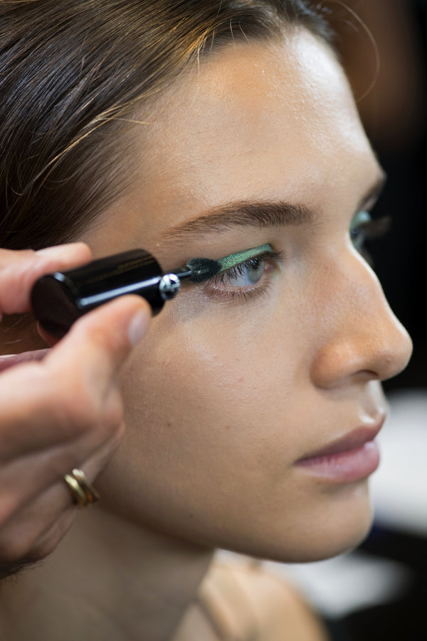 تمّ مزج لوني 37 Scarab و24 Nude Smoke من ظلال العيون Eye Tint ورسم خطّ عريض على الجفون، ومن دون التثبيت بواسطة البودرة الحرة Micro-Fil Loose Powder. وبواسطة قلم Eye-precision Brow Pencil، تم ملء الفراغات في الحواجب. وعلى العظمة تحت كل حاجب، طبّقت خبيرة المكياج الهايلايتر Neo Nude A-Highlight بالتدرّج 11. وانتهت إطلالة العيون مع طبقتين أو ثلاث من ماسكارا Eyes To Kill Classico.