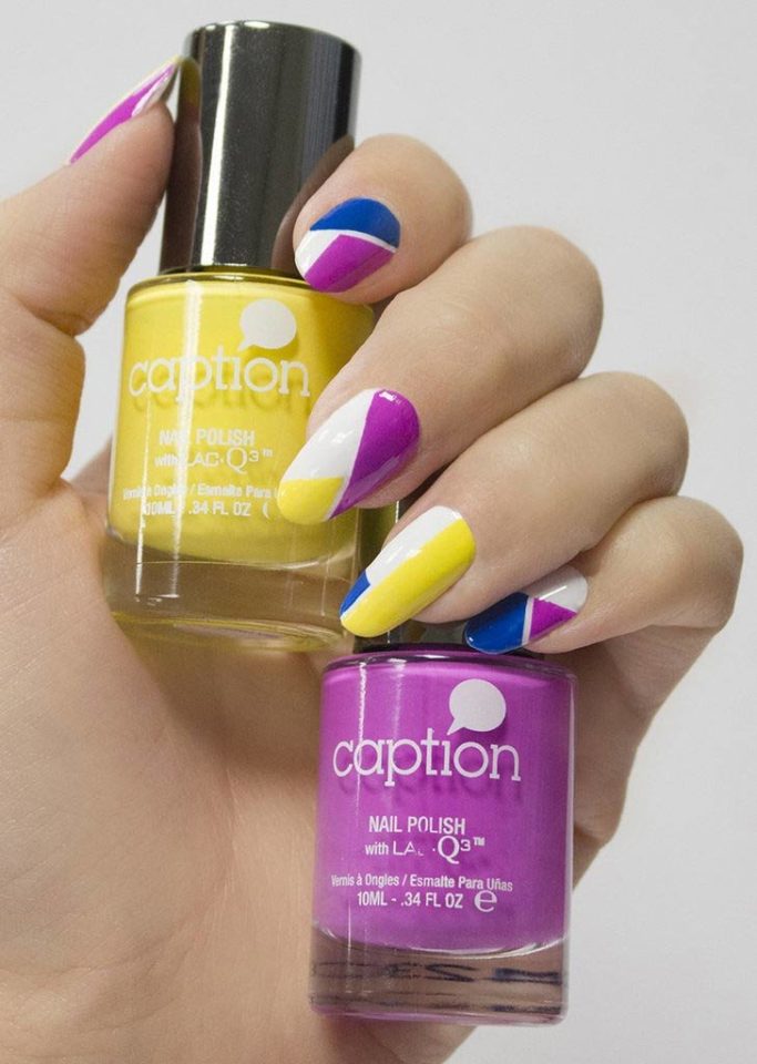 الخطوة الأولى تكون في تطبيق طلاء أظافر أبيض. ثانياً، تغطّين أجزاء من الأظافر بواسطة الشريط اللاصق حيث لا تريدين الطلاء أن يظهر، وتستخدمين الطلاء على الجزء الآخر. عندما يجف الطلاء الملون، تعيدين تكرار العملية على جزء آخر، وتضعين طلاء بلون آخر على الجزء الثاني. تنهين التصميم بالتوب كوت.