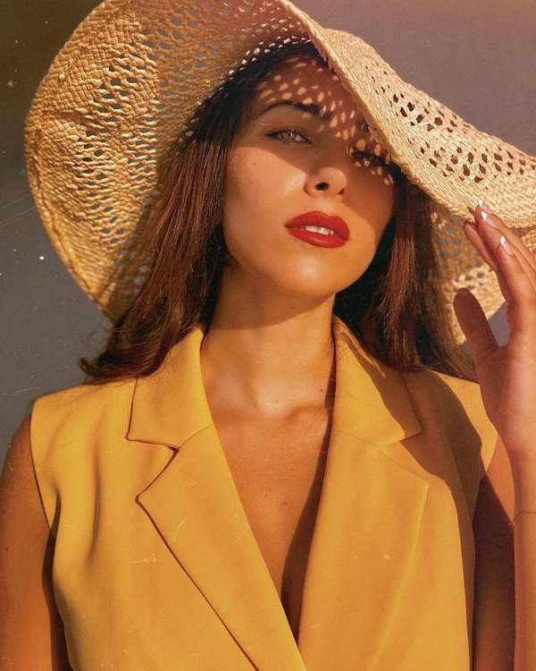 يُسلّط الضوء في هذه الإطلالة على أحمر الشفاه أحمر اللون، ويرافقه خطّ آيلاينر ناعم تماماً على العينين وسحنة ذهبية ناعمة أيضاً لإبراز جمالها حين تلفحها أشعّة الشمس.