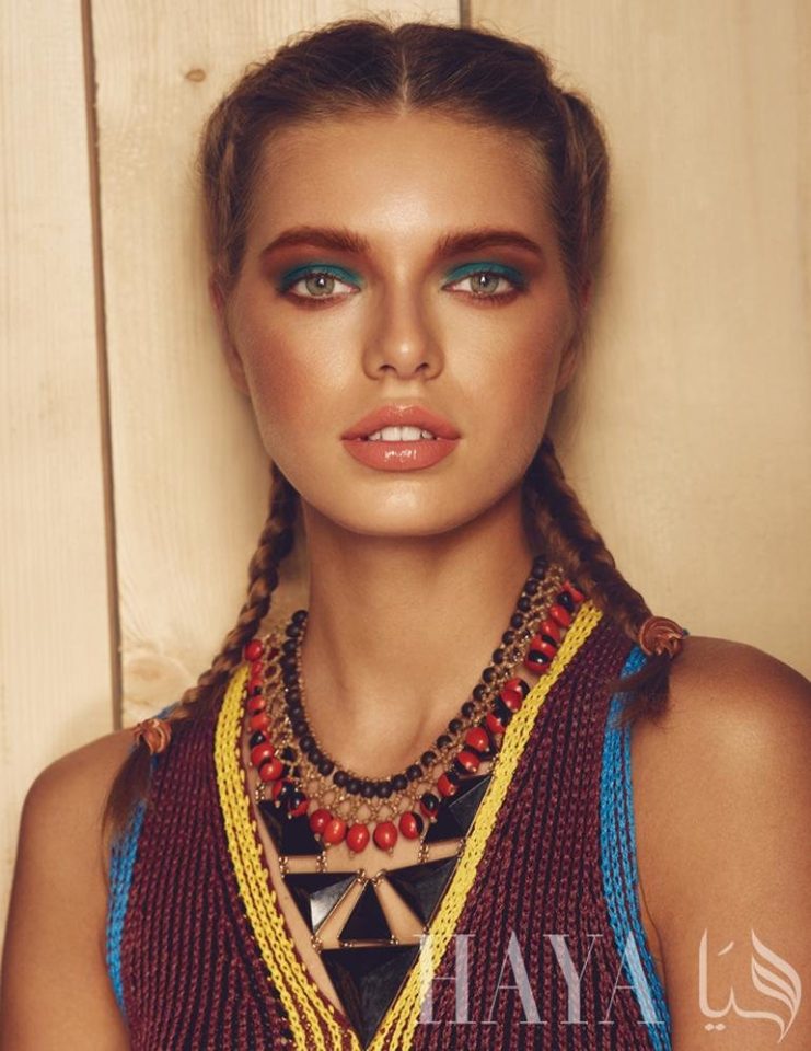 لتطبيق هذا الماكياج الذي يتميّز بألوانه الاستوائيّة، وضعت خبيرة التجميل ظلال عيون M.A.C Pro Longwear Paintpot in Painterly Set التي تمّ مزجها بطريقة ناعمة على الجفنين المتحرّكين مع ظلال M.A.C Wild Horses Eye Shadow Palette in Blue Mesa بواسطة فرشاة M.A.C 217 Brush. على الجفنين الثابتين، طبّقت ظلال M.A.C Wild Horses Eye Shadow Palette in Charcoal Brown. أما على خطّ الجفنين السفليين، فاستخدمت آيلاينر M.A.C Technakhol Eye Liner in Broque. ولإنهاء ماكياج العينين، لا بدّ من ثني الرموش نحو الأعلى بماسكارا M.A.C Zoom Lash Mascara. وللحصول على شفتين مكتنزتين، فقد تمّ ترطيبهما بواسطة مستحضر M.A.C Prep +Prime Lip من ثمّ تمّ تحديدهما بقلم M.A.C Spice Lip Pencil وتمّ تطبيق أحمر شفاه M.A.C Pure Vanity Lipstick.