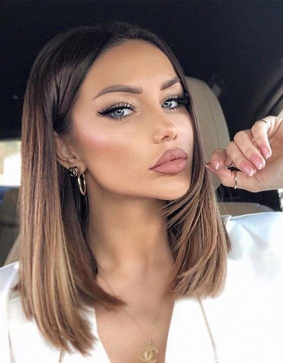 قصات شعر تحت الكتف للشعر المالس من دون غرة ولكن تم تسريحها بطريقة ناعمة.