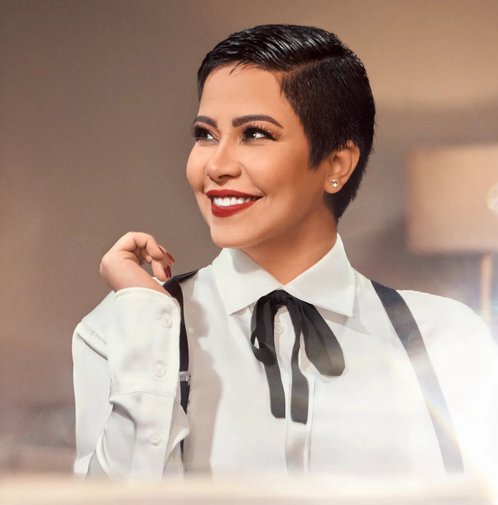 قصات شعر شيرين عبد الوهاب، وهذه الصورة تظهر شيرين عبد الوهاب وقصة شعرها القصير بعد حلق شعرها بالكامل.