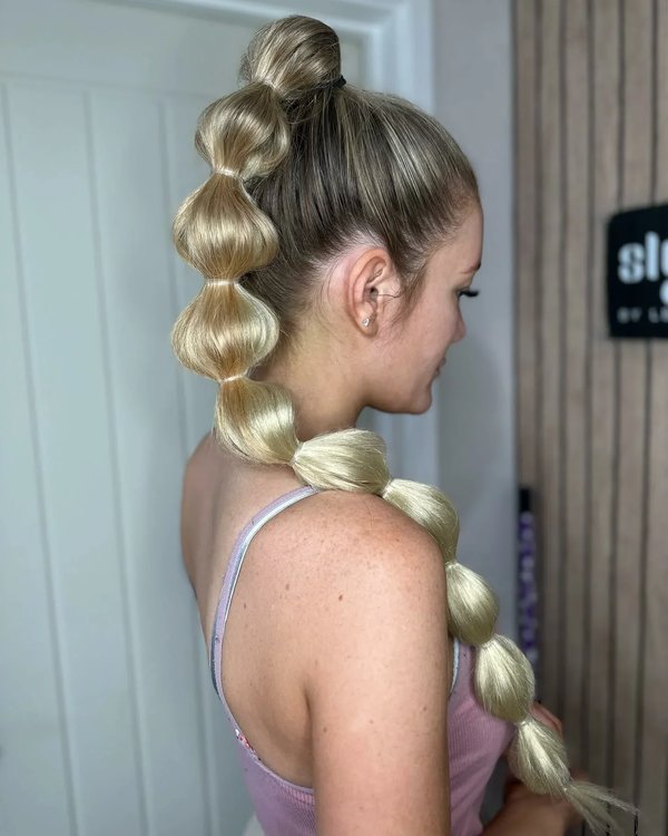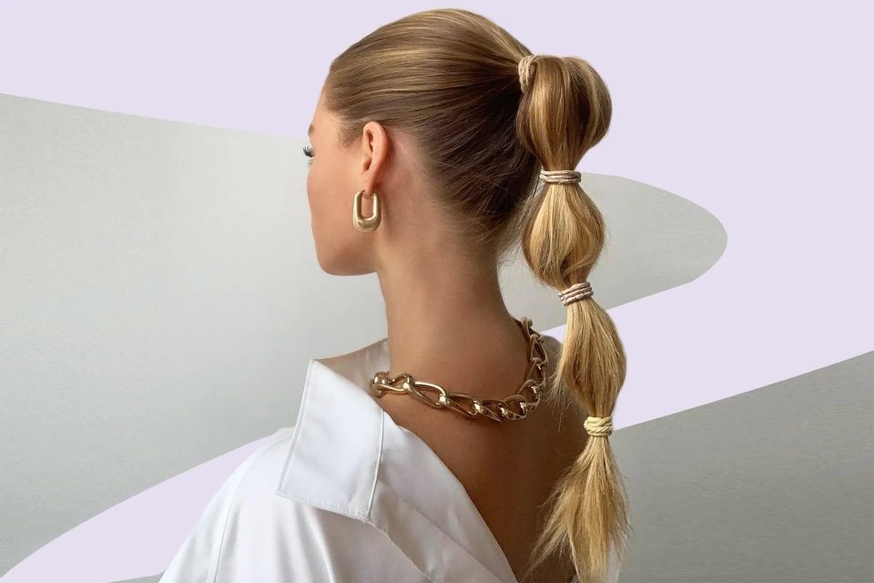 لتحقيق هذه الإطلالة، اربطي شعركِ على شكل ذيل حصان، ثم أضيفي ربطة شعر أخرى على بُعد بضعة سنتيمترات، وكرري العملية حتى تصلي إلى نهاية ذيل الحصان. أنهي التسريحة بسحب كل خصلة برفق لسحب الشعر للحصول على مظهر أنيق وكثيف في وقت قصير جدًا.