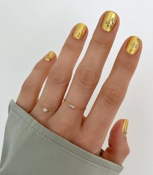 الذهبي والأصفر البرّاق أو كما يسميها البعض ألوان الشمس رائجة عند اختيار الوان مناكير صيفية ويمنك تزيينه برسمات الورود الناعمة جداً.