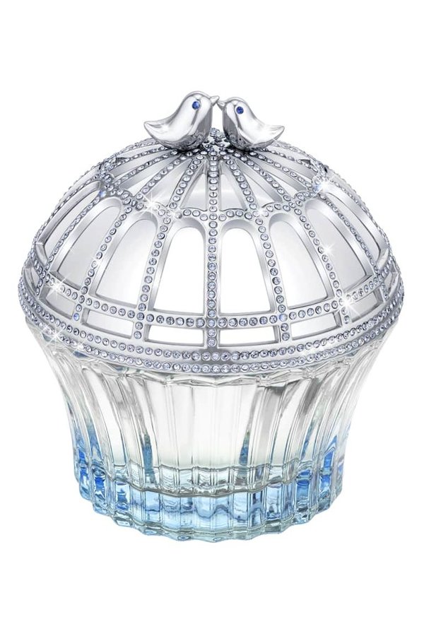 المسك الأبيض الحساس ، والياسمين الرقيق ، والبرقوق السمين يميز العصير الرومانسي ، لكن الزجاجة هي التي تضعه في أعلى قائمة أفخم عطر نسائي مع زجاجة مرصعة بالأحجار الكريمة ، تعلوها طيور حب فضية.