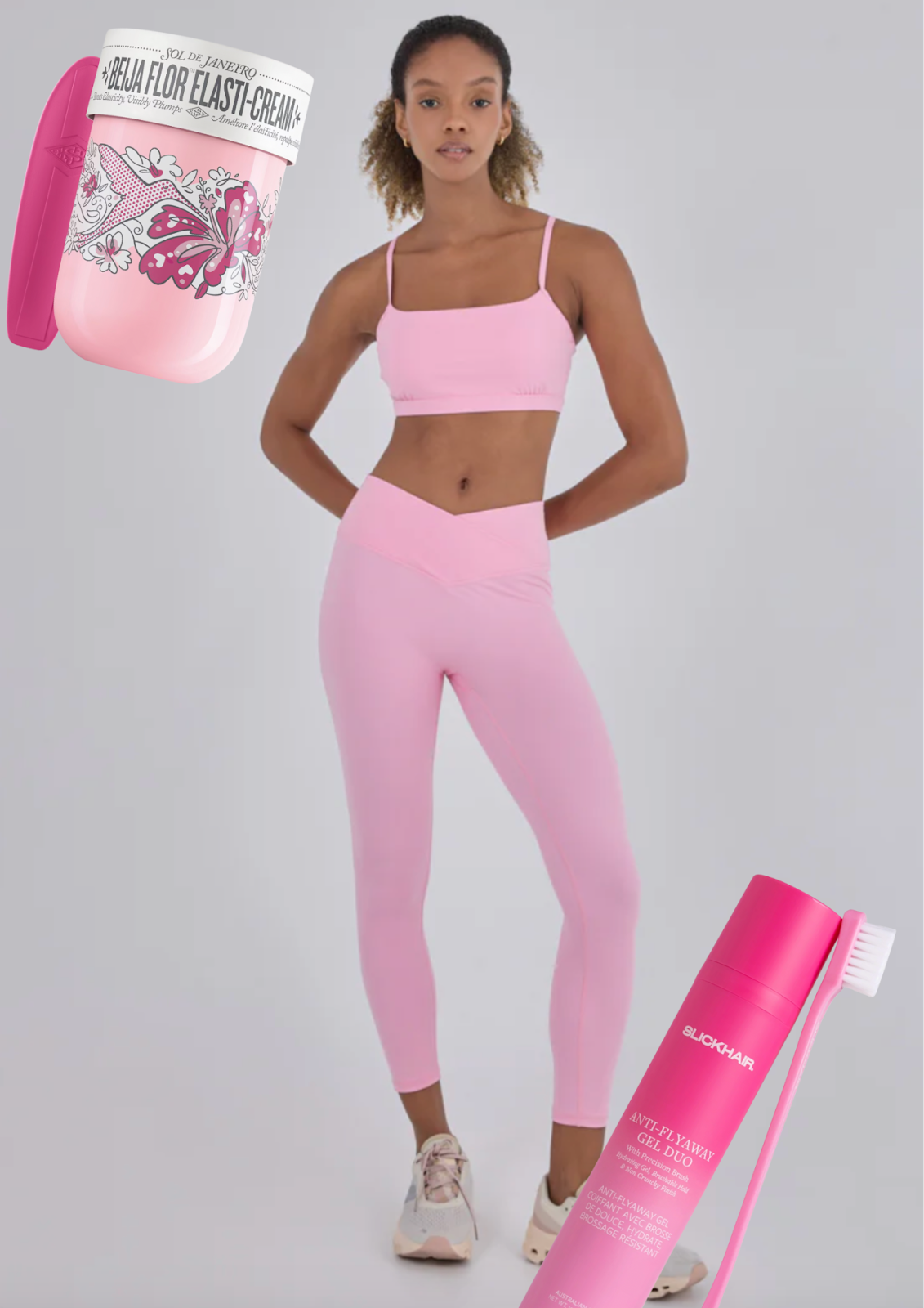 الطقم الوردي الناعم من (LC (Lifestyle Choice يمنحك طابعًا أنثويًا مفعمًا بالحيوية، ومعه كريم Beija Flor Elasti-Cream من Sol de Janeiro الذي يمنح البشرة مرونة ولمعانًا خفيفًا يعكس إشراقة التمرين، إلى جانب جل Slick Hair Anti-Flyaway Duo الذي يضبط الشعيرات الصغيرة ويترك شعرك مرتبًا بطريقة عملية وسريعة مثالية قبل أو بعد التمارين.