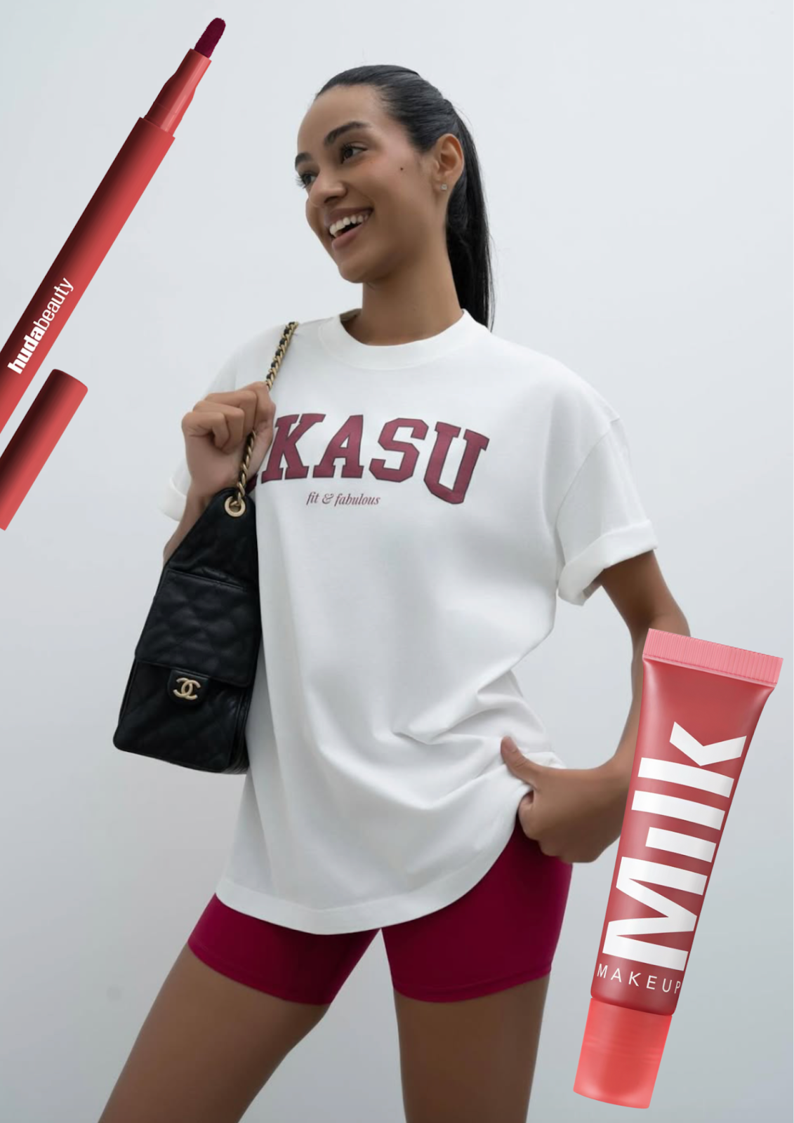 تيشيرت كاجوال وشورت رياضي بلون عميق من IKASU، مع لمسة جمالية من Huda Beauty Lip Stain Cherry Red بدرجة غنية تعزز ملامحك الطبيعية، وأخيرًا Milk Makeup Balmade Electrolyte Lip Balm Refresher لإطلالة مورّدة ومنعشة في لحظة. مزيج الألوان بين الأزياء والمنتجات يعكس توازنك بين الحيوية والأناقة اليومية.