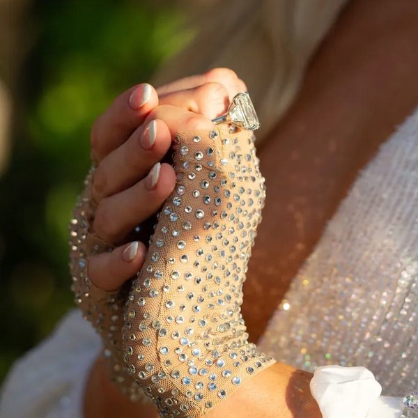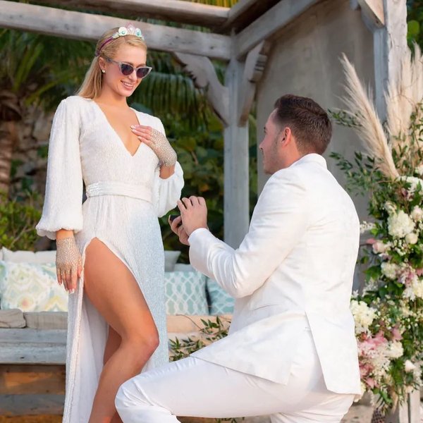 وفي هذه المفاجأة السعيدة، أطلت باريس بفستان أبيض من علامة Retrofete نسقته مع أكسسوار للرأس. أما في تفاصيل خاتم الخطوبة مصنوع من الماس صممه جان دوسيه، حفيد لويس كارتييه.