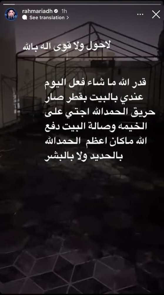 ونشرت رحمة على خاصية الستوري على انستغرام صورة لمنزلها قائلةً: "لا حول ولا قوة إلا بالله.. قدر الله ما شاء فعل اليوم عندي بالبيت بقطر صار حريق الحمدالله اجتي على الخيمة وصالة البيت دفع الله ما كان اعظم الحمدالله بالحديد ولا بالبشر".