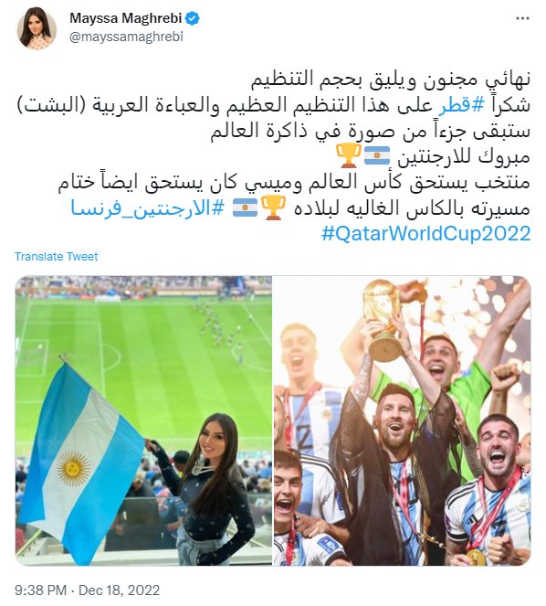 كما غرّدت ميساء مغربي على تويتر أثناء تواجدها في الملعب قائلة: "نهائي مجنون ويليق بحجم التنظيم شكراً قطر على هذا التنظيم العظيم والعباءة العربية (البشت) ستبقى جزءاً من صورة في ذاكرة العالم مبروك للارجنتين منتخب يستحق كأس العالم وميسي كان يستحق ايضاً ختام مسيرته بالكاس الغاليه لبلاده".