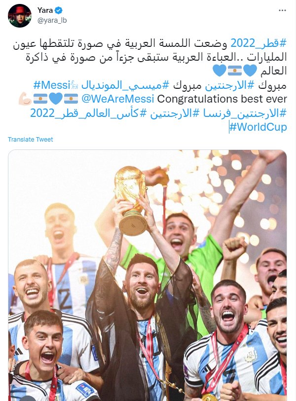 أما النجمة يارا المعروف عن حبّها لميسي فقالت:" قطر 2022 وضعت اللمسة العربية في صورة تلتقطها عيون المليارات ..العباءة العربية ستبقى جزءاً من صورة في ذاكرة العالم".