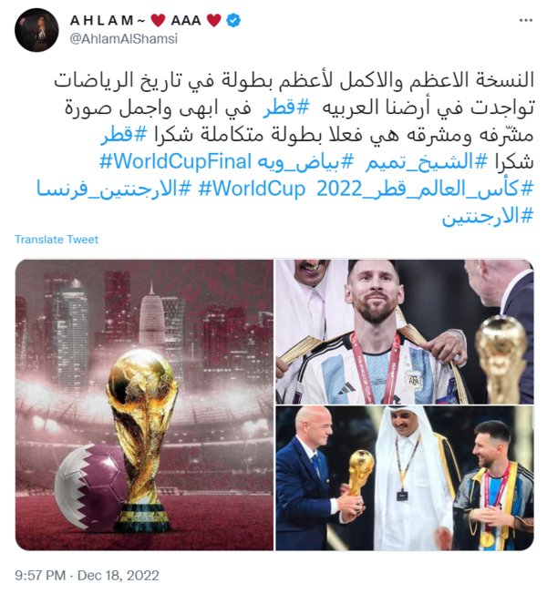 إليسا تنشر على تويتر هذه التغريدة: " من بعد ما خلص كاس العالم مش ممكن ما نحيي التنظيم الاستثنائي لدولة قطر اللي فرجت العالم كمية الاحتراف والتميز بالعالم العربي وختمتو بيومها الوطني. مبروك لإلنا هالإنجاز اللي صار على أرض عربية".