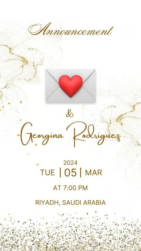 ينتظر الجمهور بشوقٍ موعد زفاف رونالدو وجورجينا رودريغيز على الرغم من عيشهما مع بعض وإنجابهما الأطفال إلا أن اسبابًا نجهلها جعلت من رونالدو يؤجل هذه الخطوة في ظل رغبة جورجينا المستمرة في هذا الأمر وقد أثارت صورة نشرتها على صفحتها الرسمية على انستغرام تساءُل الجمهور بعد أن شاركتهم دعوة غريبة تضمنت صورة قلب مع اسمها وموعد معين وهو الثلاثاء 5 مارس 2024 الساعة السابعة مساءً في المملكة العربية السعودية وتحديدًا الرياض.