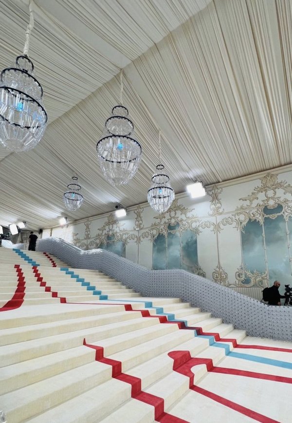 تعوّدنا دائمًا أن تكون السجادة باللون الأحمر في الحفلات العالمية وهو بروتوكول تتبّعه غالبية المناسبات المشابهة إلا أنّ سجادة الـ Met Gala 2023 تغيّرت هذا العام لتصبح باللون الأبيض المائل الى العاجي مع خطوط زرقاء وحمراء.