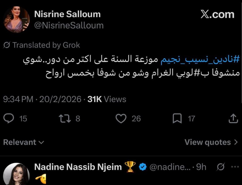 تفاعل واسع رافق رد نادين نسيب نجيم على تغريدة قارنت أدوارها السابقة بشخصيات تقدّمها حاليًا باميلا الكيك وكاريس بشار.