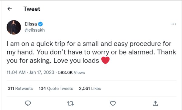 وغرّدت إليسا باللغة الإنجليزية قائلةً:" أنا في رحلة سريعة لإجراء عملية صغيرة وسهلة ليدي. لا داعي للقلق أو الذعر. شكرا لسؤالكم. احبكم كثيرً".