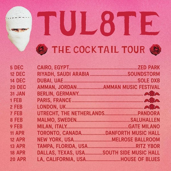 واحتفالًا بألبوم "كوكتيل" الذي طرحه مؤخرًا عبر المنصات الموسيقية، سيستهل تووليت جولته بحفلة في مصر وتحديدًا في "زيد بارك" يوم 5 ديسمبر، لينتقل بعدها الى السعودية يوم 12 ديسمبر، ودبي يوم 14 ديسمبر.