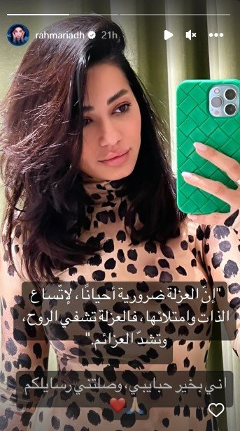 ومن دون توضيح السبب، عادت رحمة وحذفت خاصية Story، ونشرت مقولة أخرى جاء فيها: "إنّ العزلة ضروريّة أحياناً، لإتّساع الذات وامتلائها، فالعزلة تشفي الروح، وتشدّ العزائم".