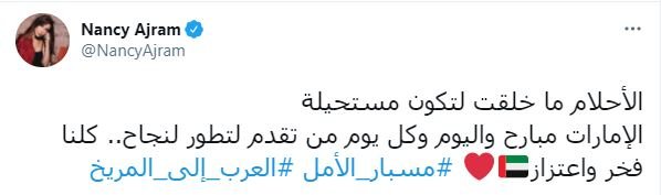 نانسي عجرم غردت على تويتر، فقالت "الأحلام ما خلقت لتكون مستحيلة، الإمارات مبارح واليوم وكل يوم من تقدم لتطور لنجاح…كلنا فخر واعتزاز".