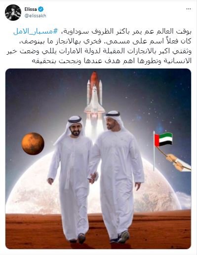 إليسا عبرت عن فخرها بهذه الإنجاز، فكتبت "بوقت العالم عم يمر باكثر الظروف سوداوية، مسبار الامل كان فعلاً اسم على مسمى. فخري بهالانجاز ما بينوصف، وثقتي اكبر بالانجازات المقبلة لدولة الامارات يللي وضعت خير الانسانية وتطورها اهم هدف عندها ونجحت بتحقيقه".