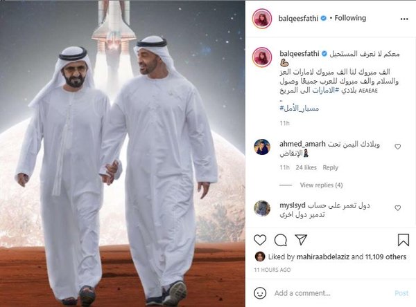 بلقيس فتحي توجهت بالتهاني إلى شعب الإمارات "معكم لا نعرف المستحيل، ألف مبروك لنا الف مبروك لامارات العز والسلام والف مبروك للعرب جميعًا وصول بلادي الامارات الى المريخ".