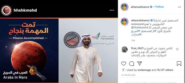 "تمت المهمة بنجاح" بهذه الكلمات أعلن نائب رئيس دولة الإمارات العربية المتحدة رئيس مجلس الوزراء، وزير الدفاع وحاكم إمارة دبي الشيخ محمد بن راشد نجاح مهمة مسبار "الأمل" بوصوله إلى مدار المريخ.