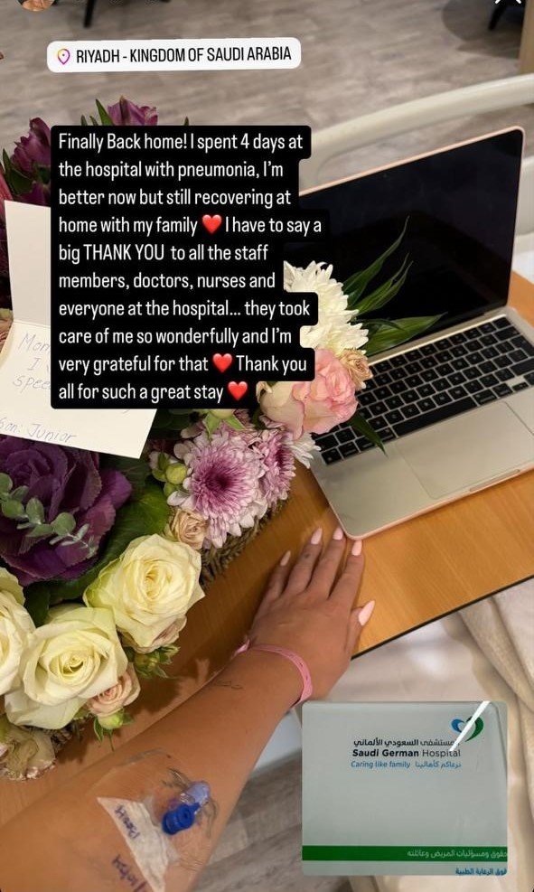 وقد علقت على هذا المنشور قائلةً: "عدت أخيراً إلى المنزل! أمضيت 4 أيام في المستشفى بسبب التهاب رئوي. لقد تحسّنت حالتي الآن، ولكنني ما زلت أتعافى في المنزل مع عائلتي".