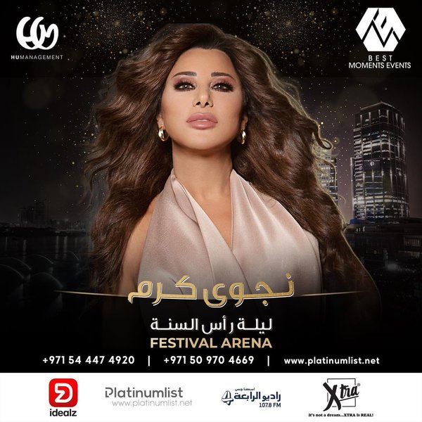 لاستقبال العام 2022، ستلتقي نجوى كرم بجمهورها في حفل غنائي ضمن Festival Arena وذلك يوم 31 ديسبمر 2021. وكتبت "خلّونا نستقبل سوا سنة الـ 2022 بالإمارات، على أمل تكون هالسنة، سنة خير على الجميع".