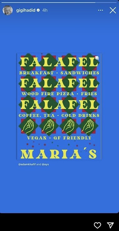 بروحها المرحة التي تعودنا عليها دائمًا، صراحتها، شخصيتها وستايلها الذي لا يشبه باقي نجمات هوليوود ، نشرت عارضة الأزياء العالمية جيجي حديد صورة عبر ستوري انستغرام تروج فيها للفلافل.