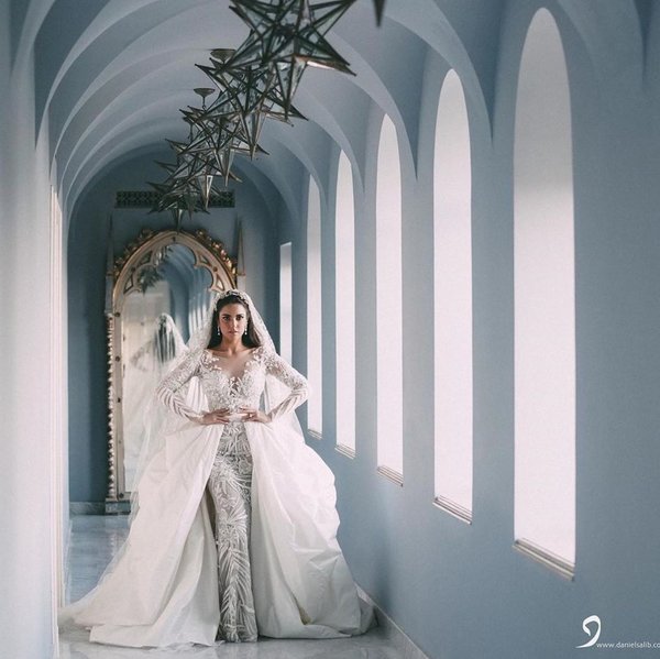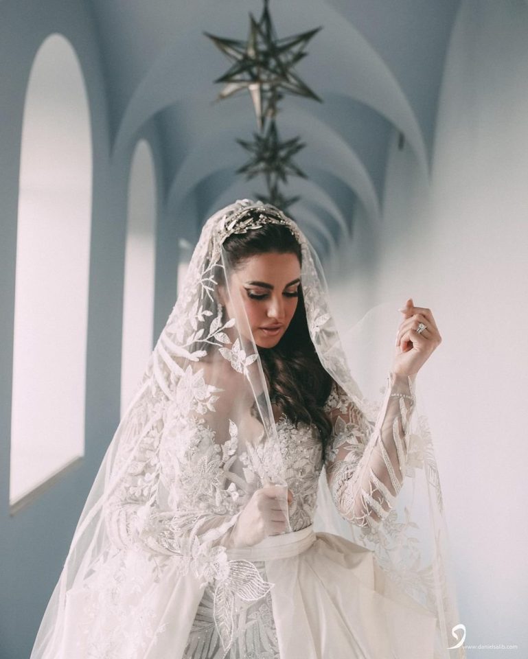 وبعد ساعات قليلة، نشرت درة صورة وهي ترتدي فستاناً أبيض مطرز مع طرحة بيضاء طويلة، من توقيع المصمم العالمي زهير مراد.