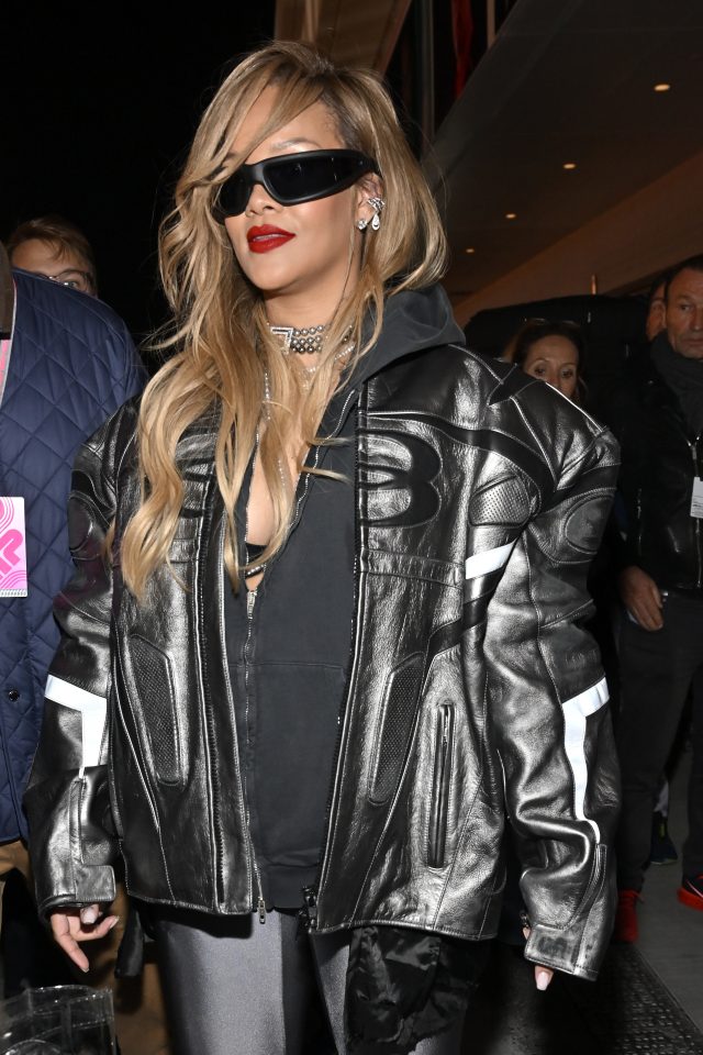 إختارت ريهانا لهذا اللوك أن تطل بشعر عسلي طويل مموج حيث لاقى لها كثيرًا وساهم في إضاءة وجهها كما ارتدت جاكيت من بالنسياغا Balenciaga بالجلد الأسود مع legging ايضًا من العلامة ذاتها.