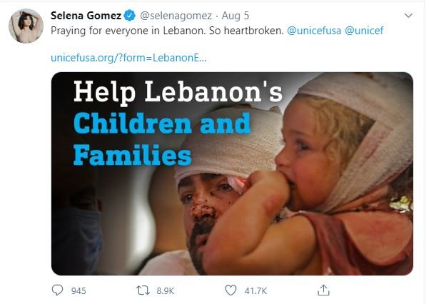 وفي تغريدة عبر تويتر كتبت غوميز "نصلي من أجل الجميع في لبنان، إنه لأمر يكسر القلب".