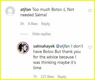 هذه الكلمات لم تمر مرور الكرام بالنسبة إلى سلمى التي قامت بالرد على هذا التعليق بكلمات قوية جداً، وكتبت: "لم أقم أبداً بالبوتوكس، ولكن شكراً على النصيحة لأنني كنت أفكّر أنه ربما حان الوقت".