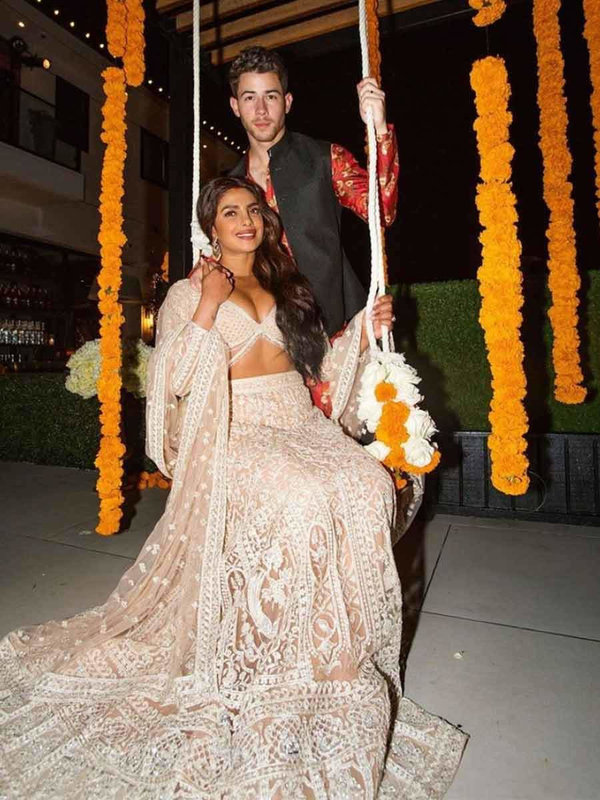 اختارت بريانكا شوبرا الزي الهندي الأبيض خلال احتفالات يوم زفافها، حتى زوجها نيك جوناس نسق إطلالة بالزي الهندي.