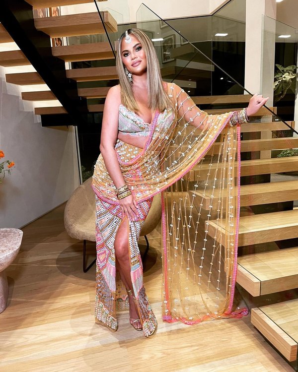 زي مميز ارتدته عارضة الأزياء كريسي تايغن مطرز باللون الأصفر والزهري، وأكملت إطلالتها بأكسسوار على الرأس.