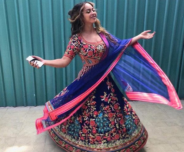 بيونسيه بزي هندي مميز بألوانه الزاهية المتنوعة، والتصميم مطرز بألوان مختلفة من الأزرق والزهري حتى النيلي.
