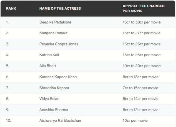فيما تتقاضى بريانكا تشوبرا جوناس، وهي أيقونة عالمية، ما بين 15 إلى 25 كرور روبية لكل فيلم. ومن أدائها الرائع في فيلم "باجيراو ماستاني" إلى تجسيدها القوي لشخصية ماري كوم في الفيلم السيرة الذاتية، تواصل بريانكا إثارة إعجاب الجماهير في جميع أنحاء العالم.