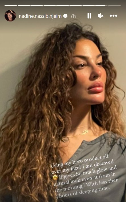 هذا ليس كلّ شيء، بل كشفت نادين نجيم أنها تستخدم إحد منتجاتها الثورية الذي يضفي لمعانًا وإشراقة على وجهها مع أنها مستيقظة منذ الساعة السادسة صباحًا مع 3 ساعات فقط من النوم.