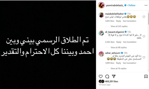 أما ياسمين وبعد أن كانت تعليقاتها ومنشوراتها عادية، فاجأت الجمهور بخبر الطلاق حيث نشرت صورة تُعلن فيها الخبر قائلةً:" تم الطلاق بيني وبين أحمد وبيننا كل الإحترام والتقدير" لترد إحدى المتابعات قائلةً :"يعني توقعات ليلي صح".