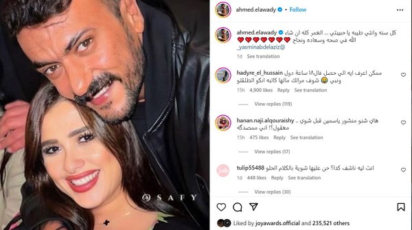 حتى الساعة احتفظت ياسمين بصورها مع أحمد العوضي ولم تحذف أيًا منها حتى أن أحمد لم يلغي صورته معها منذ أيام حيث عايدها بعيد ميلادها الـ 45.