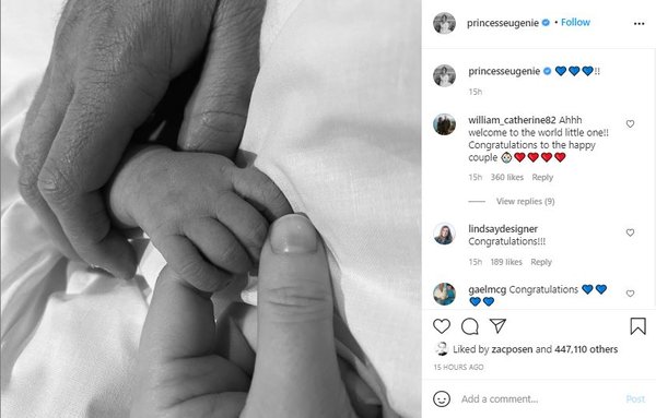 ونشرت حفيدة الملكة إليزابيث الثانية صورة بالأبيض والأسود وهي تمسك بيد مولودها الجديد، وهو صبي من خلال إرفاق المنشور بقلوب باللون الأزرق.