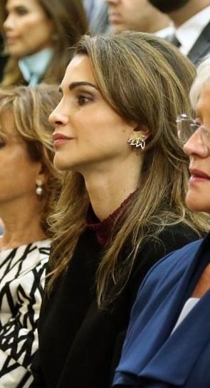 وخلال العديد من لقاءاتها، إختارت الأميرة رجوة مجوهرات تعود للملكة رانيا وكانت هذه المرة عبارة عن اقراط اذن من العلامة العريقة Stephen Webster والتي تحمل اسم Magnipheasant Plumage حيث تداخل الذهب مع الألماس.