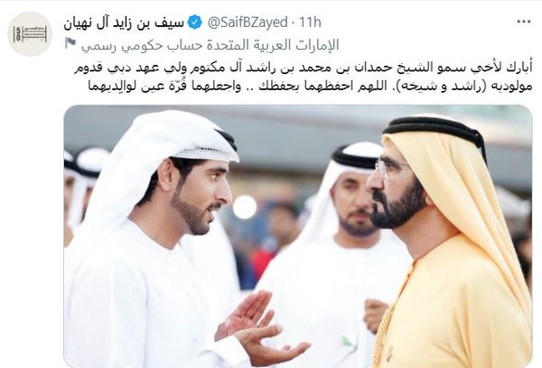 حيث كشف نائب رئيس مجلس الوزراء سيف بن زايد آل نهيان، عن أسماء الطفلين الجديدين فكتب: "أبارك لأخي سمو الشيخ حمدان بن محمد بن راشد آل مكتوم ولي عهد دبي، قدوم مولوديه "راشد و شيخة"، اللهم احفظهما بحفظك، واجعلهما قُرّة عين لوالِديهما".