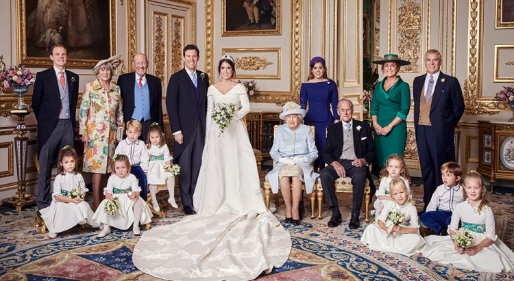 وقد ظهرت الأميرة يوجيني مع زوجها جاك بروكسبانك محاطين بأفراد العائلة وإلى جانبهما الملكة إليزابيث والأمير فيليب، والأمير آندرو وزوجته سارة فيرغسون والدا العروس، وشقيقتها الأميرة بياتريس، بينما ظهر من جهة العريس والداه وشقيقه.