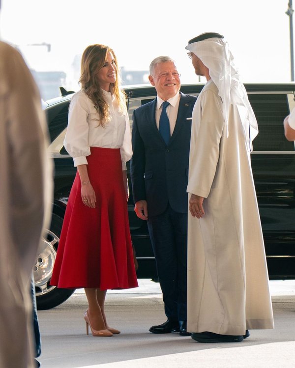 لا يمكننا أن نتحدث عن الملكة رانيا من دون أن نتتطرق إلى إطلالتها، حيث اعتمدت لوكاً عصرياً فنسقت تنورة حمراء اللون ذات الخصر العالي والثنيات الواسعة مع قميص أبيض اللون بأكمام فضفاضة. وأكملت إطلالتها مع حذاء نيود بالكعب العالي.