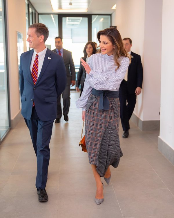 مع الفساتين أو حتى التنانير والسراويل الواسعة ذات الخصر العالي، تحرص الملكة رانيا على اعتماد حزام الخصر بمختلف تصاميمه أكانت رفيعة أو عريضة.
