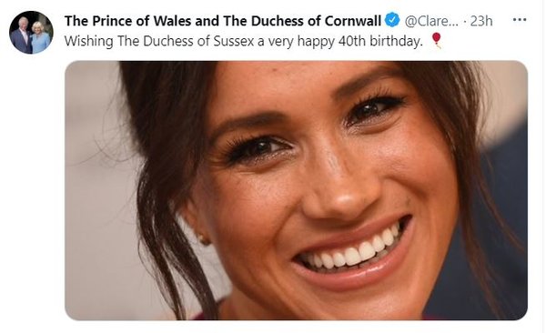 بدورهما، هنأ الأمير تشارلز وزوجته كاميلا باركر ميغان ماركل بعيد ميلادها وذلك باستخدام العبارة نفسها التي نشرها دوق ودوقة كامبريدج.